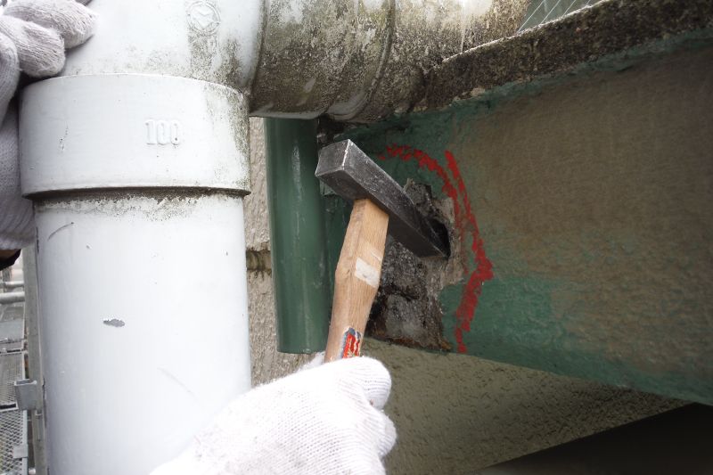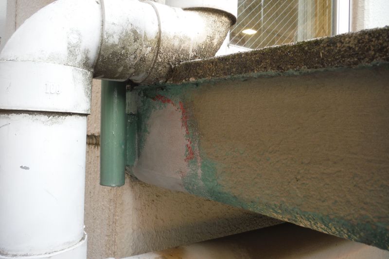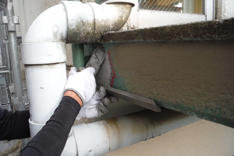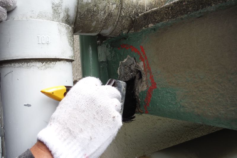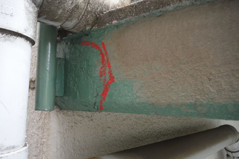 また同じ建物で別の個所。外配管が通っている見えにくいところですが、クラックが入っているので補修を行っています。