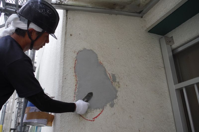 クラックの入った部分を斫り、綺麗に清掃してプライマーを塗布。 そのあとは樹脂モルタル充填、表面を成形して整えていきます。